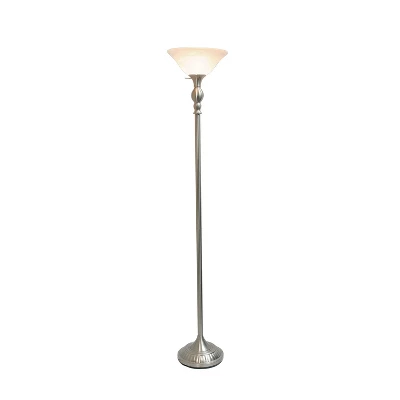 Light up your bedroom, office, foyer or living room with this elegant yet affordable 3 light floor lamp. It features a stunning brushed nicklel finish and marbleized white shades with spiraled cut glass to complete the timeless look. This is a very traditional style lamp that is primarily made up of metal contents.