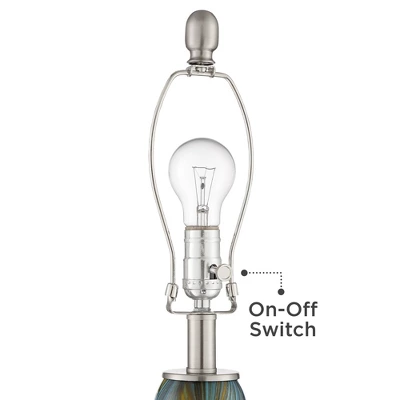 Enjoy the elegant design and shifting color tones of these modern art glass table lamps from the 360 Lighting brand. Each lamp features an arresting glass body with a swirl of browns and blues, complemented by the classic brushed nickel finish metal base at the bottom. A white drum shade on top completes the contemporary look, making the set well suited to a light airy bedroom or sunny family space.