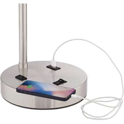 Perfect on a side table, nightstand or home office, these workstation desk lamps are paired with white linen drum shades. From the 360 Lighting brand, they have an integrated built-in outlet and a USB port that allows you to charge a phone or small electronic device.
