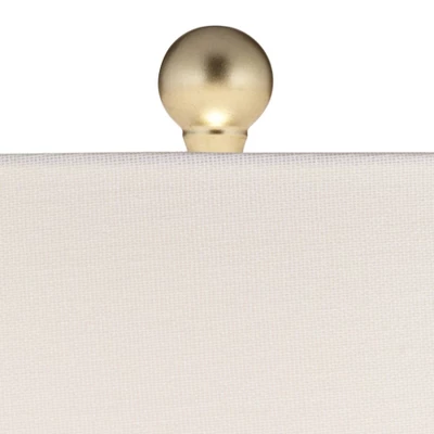 - Tapered drum shade in a white fabric with a gold finish finial. 8-foot long cords.