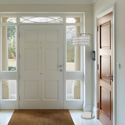 Add a glam lighting option to your bedroom, living room or foyer with this 61.5″ H Quigley Silver Drum Shade Floor Lamp from River of Goods. This floor lamp showcases a chrome-finish silver metal candlestick base and a white fabric drum shade with silver metal charms for a standout look with a touch of shine. The lamp requires one 60-watt E26 bulb (not included) to cast a soft, warm glow, and the 90-inch cord with a foot switch allows for versatile placement in any room.