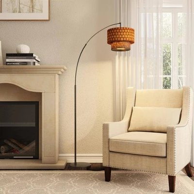 A smart lighting choice for sectionals or intimate seating areas, the Gala arc floor lamp provides a practical and stylish accent with its black kaleidoscope patterned fabric shade. The adjustable arc rod and double shade plus three-way lamping assures plenty of control over the direction and level of light. A 3-way rotary socket switch will only work with a 3-way light bulb, otherwise this lamp will function with simple on/off switch at its highest setting. This floor lamp has a black cord and is smart outlet compatible. Bulb is not included.