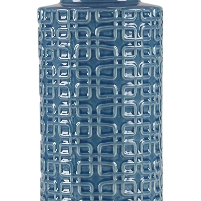 The INK+IVY Jayda Geometric Ceramic Table Lamp offers a sophisticated modern touch to your living room decor. This table lamp features a cylinder-shaped, blue ceramic base with a patterned design that creates dimension and texture. The round drum lamp shade softly filters the light to create a warm and welcoming ambiance in your space. Illuminate your living room and give your home a chic contemporary update with this ceramic table lamp. Handle with care. Spot clean only.