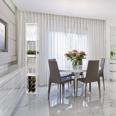 Reserve some of your best wine while illuminating your living space in style with our floor shelf lamp and wine rack. This gorgeous piece adds versatility as the shelves can be used to display photographs and other memorabilia, while accommodating space for your wine glasses and bottles. The linen lamp shade casts a soft, warming light throughout your living space. This lamp adds sophistication and style to any home’s dĂ©cor.