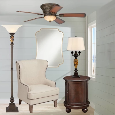 Ideal for general room illumination, this Kathy Ireland design is the perfect marriage of form and function. It features traditional styling with a frosted glass shade and tortoise shell glass font.