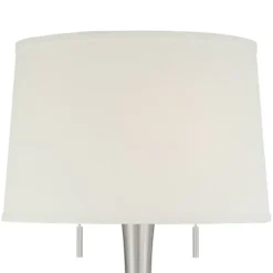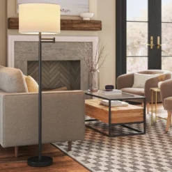 Light up your home in chic style with this Metal Column Swing Arm Floor Lamp from Threshold™. This floor lamp features a slim metal column that has a swing arm and is topped with a white drum shade to complete the fresh look. Plus, its black finish effortlessly complements a range of decor styles. Place it next to an armchair in your seating area or living room to light up and decorate your space.