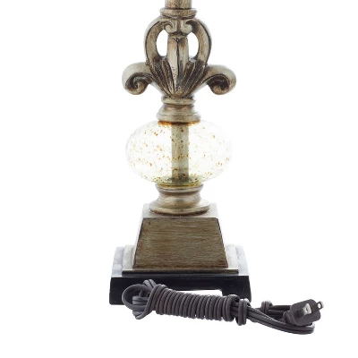 - A buffet lamp crafted of solid metal, polystone, glass, and linen