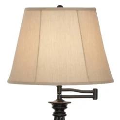 Two beautiful shades of brown adorn this urn-shape table lamp with a gracefully carved center font and a simple round finial. A square stand is a wonderful complement to its round base. The classic beige cut-corner shade has dark brown trim.