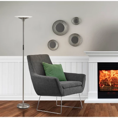 A sleek, modern style, the Solar LED Torchiere supports wellness by syncing your indoor lighting up with your circadian rhythm. By adjusting your lamp’s color temperature throughout the day you can simulate the natural progression of the sun, helping to regulate the body’s internal clock to improve sleep habits and overall personal health. The color of the light is controlled by a sleek touch switch located on the pole, which is also used to adjust the light intensity offering a full range of brightness options. With a brushed steel finsh and a frosted glass shade, the Cosmo LED Torchiere is a modern, versatile look that will fit in and elevate any home style. Place this lamp in your living room or bedroom to fill the room with 2200 lumens of bright, ambient lighting. All Adesso lighting product is either UL or ETL listed, meaning that it has been tested and approved to meet the government-regulated safety standards for the USA.