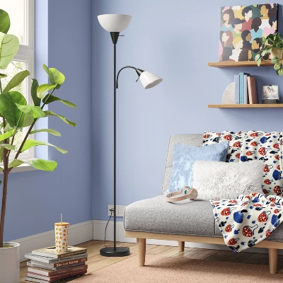 This Torchiere with Task Light Floor Lamp from Room Essentials™ can be placed near an armchair, bedside or desk. It features an upward-facing white bowl shade that’s attached to a slim metal stand with a pedestal base, and it comes with a fully adjustable reading light so that the light can be positioned where it’s most needed. The turn-knob rotary switch with on/off light setting offers easy function, and the included LED bulbs allow for immediate use.